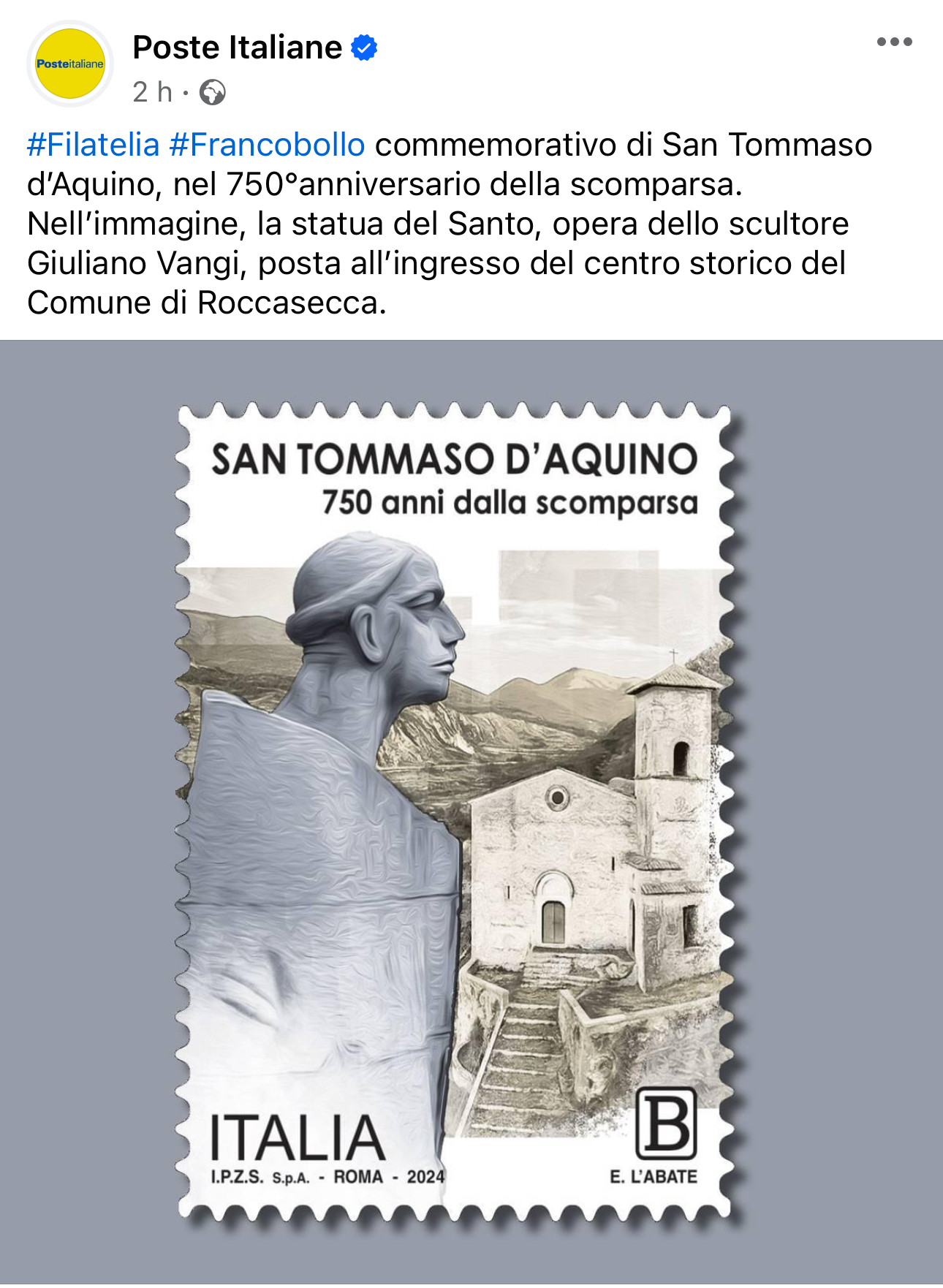 ROMA – Un francobollo italiano, valido per la posta ordinaria, celebra oggi San Tommaso d’Aquino nel 750.mo anniversario della morte.