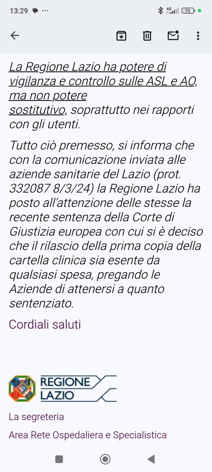 In ogni caso, il cittadino ha vinto la sua battaglia, ottenendo non solo un rimborso da parte della Asl ma anche la certezza che l’ente pubblico si sta adoperando per far sì che ogni cittadino, da ora in avanti, potrà ottenere in via totalmente gratuita la prima copia della sua cartella clinica in caso di ricovero in ospedale pubblico.