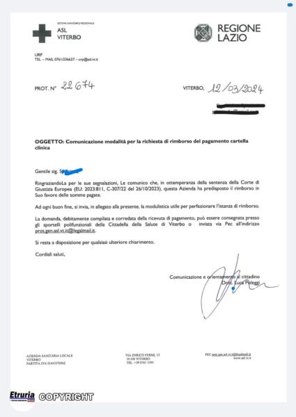 VITERBO – La prima copia di una cartella clinica richiesta dal paziente deve essere concessa gratuitamente. Lo ha deciso la Corte di Giustizia Europea con la sentenza EU:2023:811, C-307/22 del 26/10/2023 ma solo in questi ultimi giorni la notizia sta venendo recepita dalle Asl italiane, con adeguamenti anche nel Viterbese grazie all’impegno di un cittadino che ha sollevato la questione, vincendo la sua non semplice “battaglia” contro la burocrazia italiana.