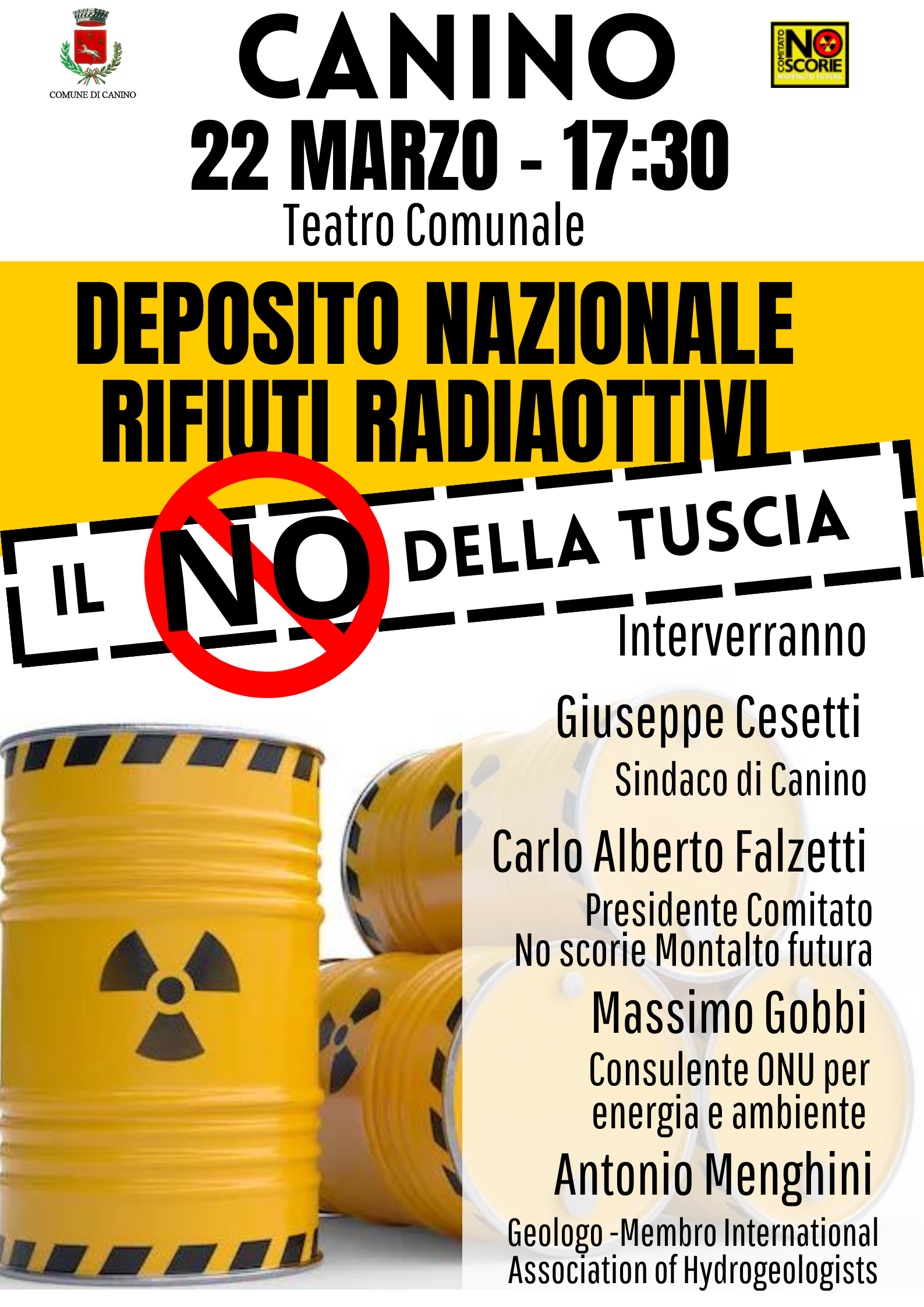 Interverranno il sindaco Giuseppe Cesetti, Carlo Alberto Falzetti, del comitato “No scorie, l’Ing. Massimo Gobbi, consulente Onu per energia e ambiente, Antonio Menghini, geologo e membro dell'”International Association of Hydrogeologist”.