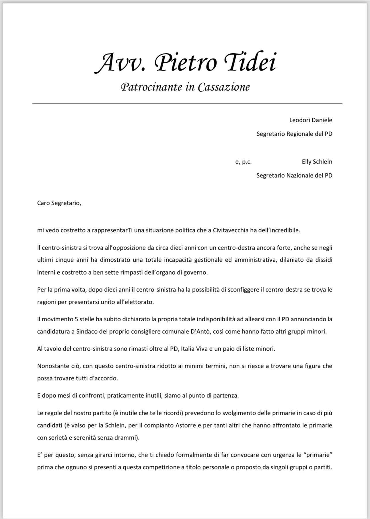 La lettera di Pietro Tidei a Daniele Leodori