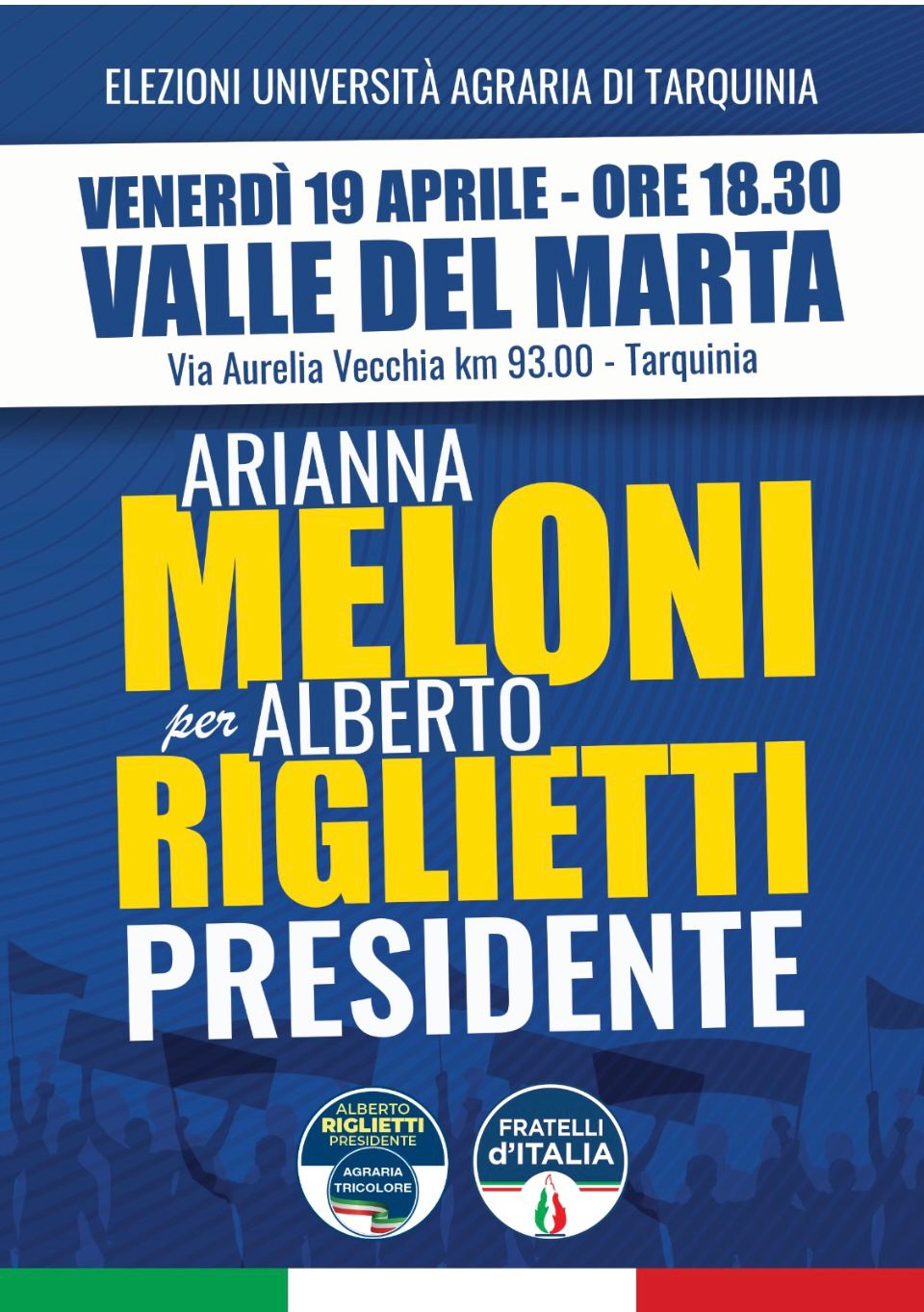 TARQUINIA – Grande chiusura per la campagna elettorale di Alberto Riglietti e la squadra di Agraria Tricolore che si terrà a Tarquinia alla presenza, tra gli altri, anche di Arianna Meloni.