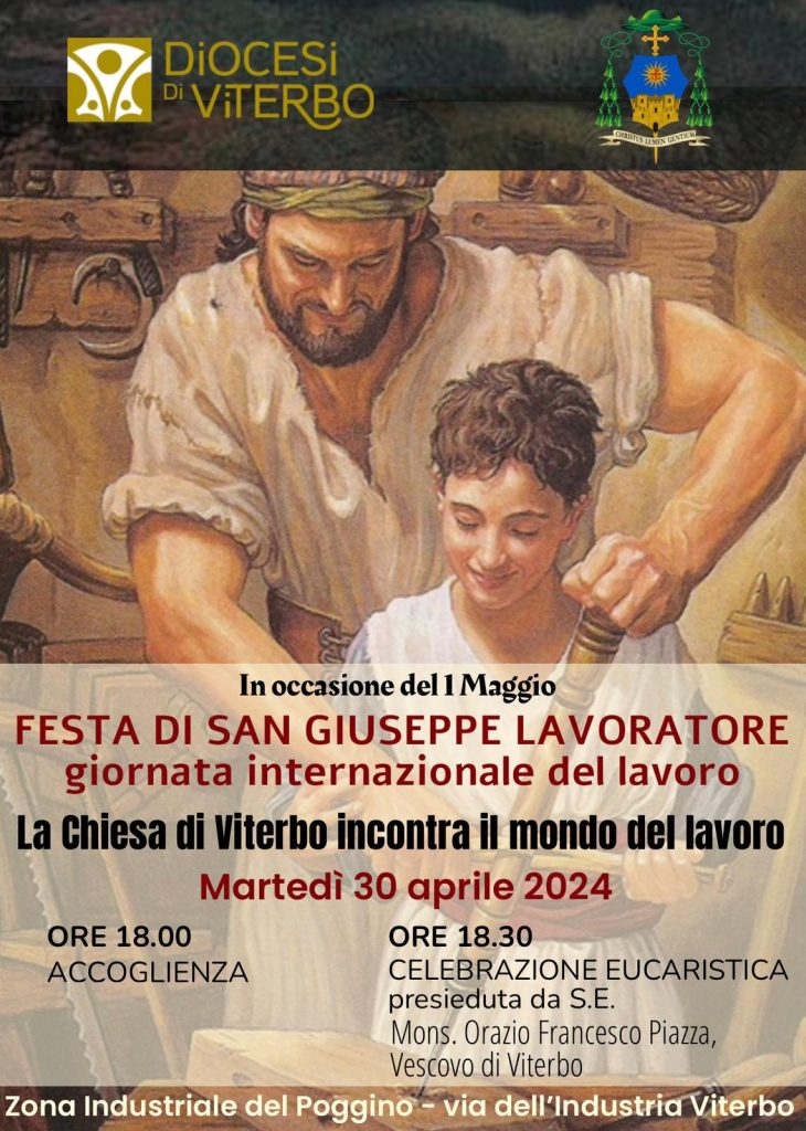 VITERBO – In occasione del I Maggio, Festa di San Giuseppe Lavoratore e della Giornata Internazionale del Lavoro, la Diocesi di Viterbo e il Comune di Viterbo, su iniziativa degli operatori e attività del Poggino, parteciperanno alla Celebrazione Eucaristica presieduta dal vescovo di Viterbo S.E. Mons. Orazio Francesco Piazza, che si terrà il giorno 30 aprile, alle ore 18.00, a Viterbo presso Via dell’Industria (piazzale antistante CIA) LOC. Poggino.