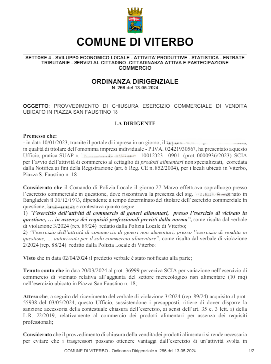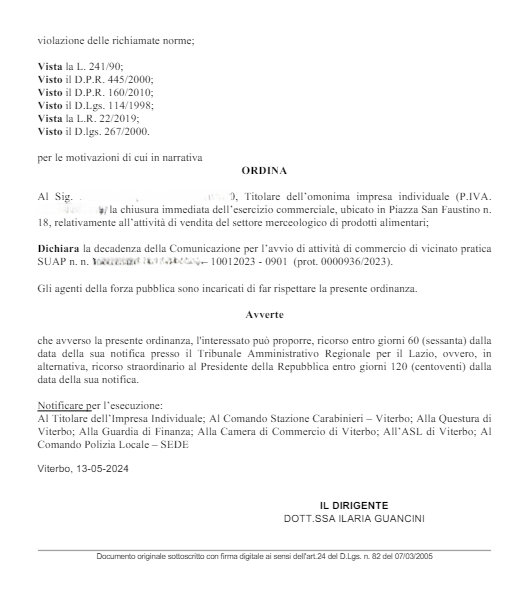 Di seguito, la determina comunale con la quale il Comune imponeva la chiusura dell’esercizio e dove veniva esplicitamente espresso che “Gli agenti della forza pubblica sono incaricati di far rispettare la presente ordinanza”.