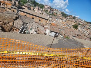 ACQUAPENDENTE (VT) – Tragedia sfiorata questa mattina ad Acquapendente. Intorno alle 9 una parte di muro della Piazza dell’Orologio, in pieno centro storico, è crollata, provocando un forte boato e
