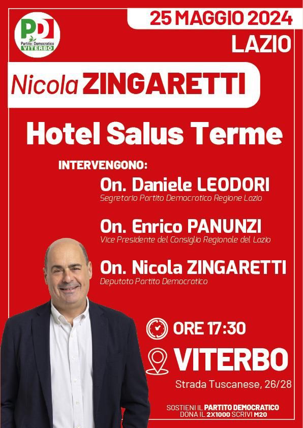 VITERBO – Appuntamento all’Hotel Salus Terme, domani 25 maggio alle 17.30 con il deputato del Partito Democratico Nicola Zingaretti, ex governatore della Regione Lazio.