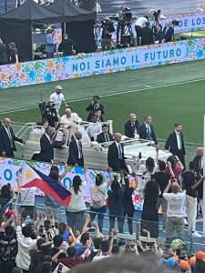 Poi un bambino rom da Scampia chiede: “Come si fa ad amare tutti, tutti, tutti?”. Infine una ragazza dal Pakistan: “E’ vero che siamo tutti fratelli e sorelle?”.