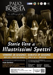 A chiudere e la programmazione, venerdì 28 e sabato 29, alle 21,30 e alle 22,30, “Storie vere di illustrissimi spettri”, un vero e proprio tour teatrale notturno al Forte dei Borgia. “Il percorso inizia da Porta Romana, prosegue sulla via Amerina e attraversa l’intera dimora storica illuminata dalle fiaccole. Sul grande palcoscenico naturale del Forte, evocate dagli Spiriti Guida, vanno in scena le vicende di personaggi leggendari: il Duca Valentino, Lucrezia e Rodrigo Borgia, Giulia Farnese. A completare l’affresco dell’epoca, altre figure emblematiche: la Strega, la Monaca, il Decapitato e i Duellanti. Gli Illustri Spettri, con i loro racconti accompagnati dalle melodie antiche del coro e del flauto, trasporteranno il pubblico al tempo di epiche passioni, ambizioni sfrenate, violenze e inganni, bellezza e spiritualità.