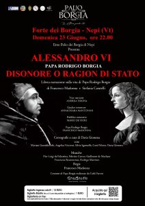 ”La domenica successiva, il 22 giugno, alle 22, sarà la volta di “Alessandro VI – Disonore o ragion di stato”: in scena la libera narrazione sulla vita del Papa Rodrigo Borgia, in una rappresentazione che vuole evidenziare “gli stati d’animo e le emozioni vissute dal discusso Papa Rodrigo Borgia, nel contesto degli avvenimenti che lo videro protagonista del suo tempo. Forti passioni, alleanze e lotte con il nemico in seno allo stato pontificio, storie ormai celebri, interpretate in tutto il mondo, piene, come in tutte le vicende umane, di luci e ombre.