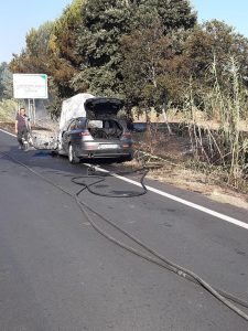 CERVETERI (RM) – Un’altra giornata di fuoco a Cerveteri. Questa volta l’emergenza si è verificata sulla Via Settevene-Paolo nuova, dove, poco dopo le 17, una Alfa Romeo 159 sw è stata avvolta dalle fiamme. Ancora da stabilire quali siano state le cause che hanno scatenato il rogo. Proprio in questi minuti sul posto stanno intervenendo gli uomini della Protezione Civile di Cerveteri, capitanati da Renato Bisegni, per le operazioni di spegnimento. La ProCiv si è mobilitata con due pick-up e con l’autobotte da 10mila litri in supporto. Sul posto sono presenti anche i Vigili del fuoco.
