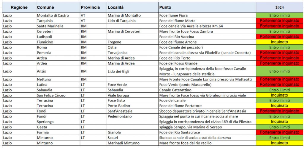 Nel dettaglio le località risultate gravemente inquinate al monitoraggio sono la foce del fiume Marta a Tarquinia, in provincia di Viterbo; la foce del Verde, lo sbocco del depuratore privato in Canale Sant’Anastasia a Fondi, la foce del rio Santa Croce a Gianola a Formia, in provincia di Latina; la foce del canale in via Aurelia al km 64 a Santa Marinella, la foce del rio Vaccina a Ladispoli, la foce del canale altezza via Filadelfia (canale Crocetta) a Torvajanica, la foce del rio Torto e la foce del Fosso Grande a Marina di Ardea e il mare di fronte alla foce del canale Loricina presso via Matteotti a Nettuno, in provincia di Roma. Tra i punti risultati inquinati molti sono frequentati dai bagnanti da Terracina a Santa Marinella, da Gaeta a Terracina e Sperlonga. Colpa soprattutto della mancanza di depuratori funzionanti, che fanno dei punti di immissione delle acque in mare punti critici.