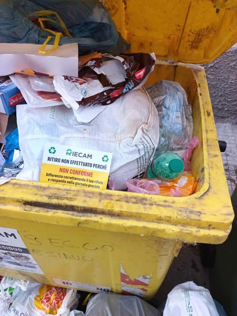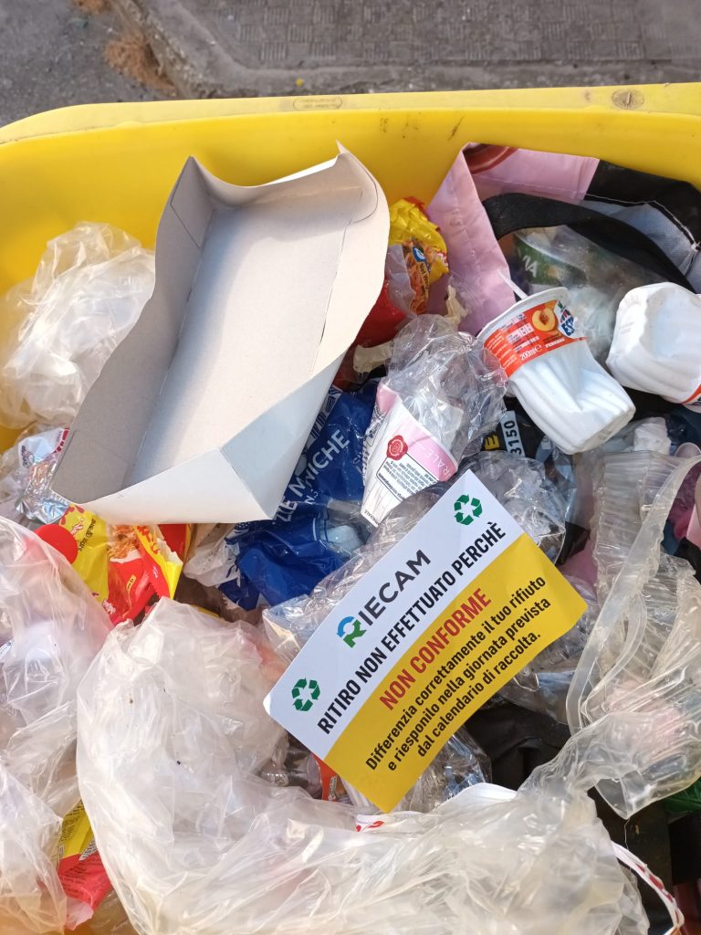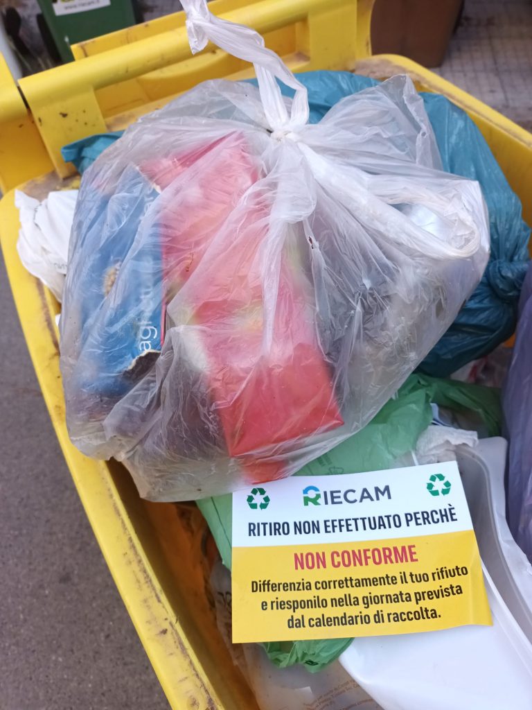 Gli operatori della Riecam continuano a censurare il comportamento dei trasgressori mettendo i bollini del “rifiuto non conforme” ma anche questo sembra servire a poco.
