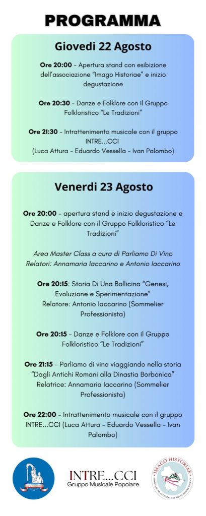 Nel segno del più vibrante folclore Ponziano, le due serate della manifestazione (22-23 agosto 2024) saranno allietate da musiche, danze e balli di pacchianelle e giullari per tutta l’isola, mentre i fucilieri borbonici saranno promotori dell’evento con buon cibo e buon vino:• Giovedì 22 agosto è prevista la degustazione di pietanze e vino della Cantina Enodelta “il Vino dei Nobili” presentato dai I Mago Historiae con balli tradizionali delle Pacchianelle e Giullari di Minturno;• Venerdì 23 agosto, i sommelier Antonio e Annamaria Iaccarino presenteranno e approfondiranno rispettivamente i temi legati all’enologia con due interventi: “Storia di una bollicina” e “Parliamo di vino: un viaggio nella storia dagli Antichi Romani alla Dinastia Borbonica”.