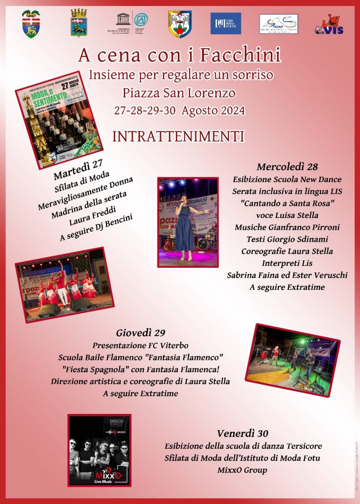 VITERBO – Tornano le molto attese “Cene in piazza” dei facchini di santa Rosa dal 27 al 30 agosto. A organizzare, come sempre, il Sodalizio dei facchini, che ospiterà in piazza San Lorenzo il banchetto atto a finanziare opere di beneficenza.