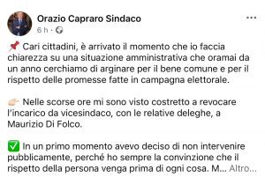 “Cari cittadini, è arrivato il momento che io faccia chiarezza su una situazione amministrativa che oramai da un anno cerchiamo di arginare per il bene comune e per il rispetto delle promesse fatte in campagna elettorale.