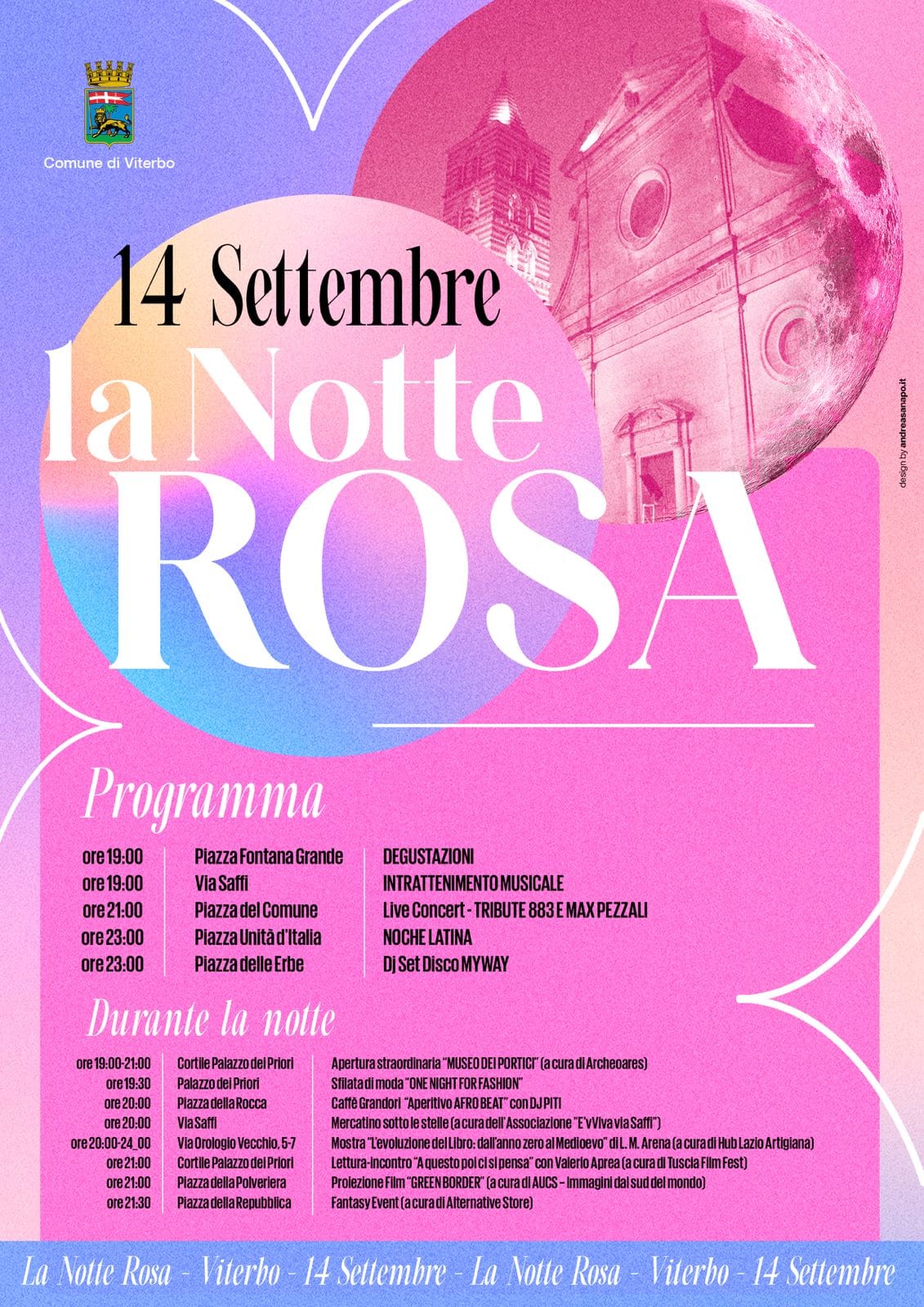 VITERBO – Sabato 14, a partire dal tramonto, il centro storico del capoluogo accoglierà l’aria di feste e la musica della Notte Rosa, format che negli scorsi anni ha sempre incontrato grande interesse da parte del pubblico di ogni età, permettendo anche all’economia locale di tirare un sospiro di sollievo.