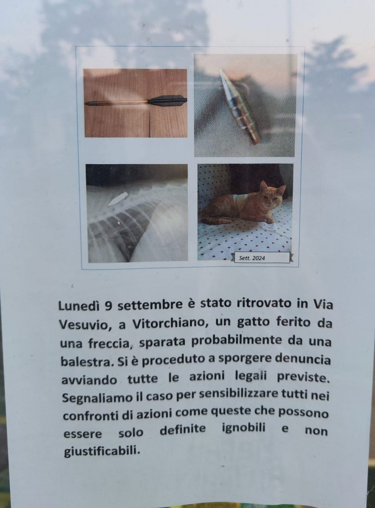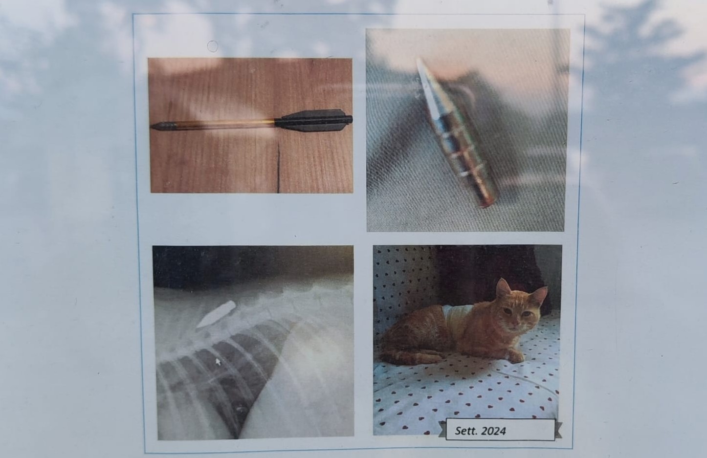 VITERBO – Il 9 settembre un gatto è stato ritrovato ferito da un dardo da balestra nel centro storico di Vitorchiano, in via Vesuvio. Un fatto che ha subito fatto scattare l’allarme tra gli abitanti del piccolo borgo della Tuscia con relativi avvisi che sono stati affissi in molte vie e strade.