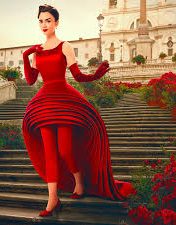 Un altro importante nome della moda italiana spicca nella serie, a riportarcelo alla mente il rosso e scultoreo abito indossato da Emily (anche) nella locandina di Netflix sulle celeberrime scale di Trinità dei Monti: un chiaro tributo al genio di Roberto Capucci e al fashion degli anni ‘50. Abito che Capucci concepì nel 1956 osservando i cerchi concentrici che si formavano quando un sasso veniva gettato in una pozza di acqua. Uno dei più grandi couturier del tempo insieme alle sorelle Fontana, Fernanda Gattinoni ed Emilio Schuberth.