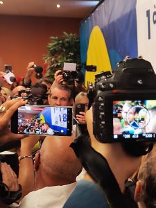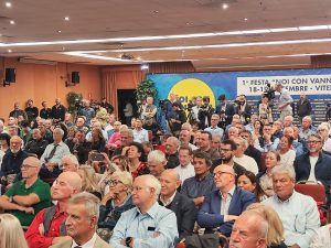 Tanti, tantissimi gli intervenuti, che riempiono la sala e scaldano il loro idolo con applausi ed incitamenti, spronandolo ad andare avanti sul suo cammino nonostante gli attacchi quotidiani alla sua persona e alle sue affermazioni.
