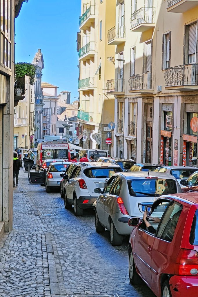 Dalle 10,30 circa, in contemporanea con il passaggio della Straviterbo, si è formata una lunghissima coda di auto da Porta Romana fino a piazza del Comune.