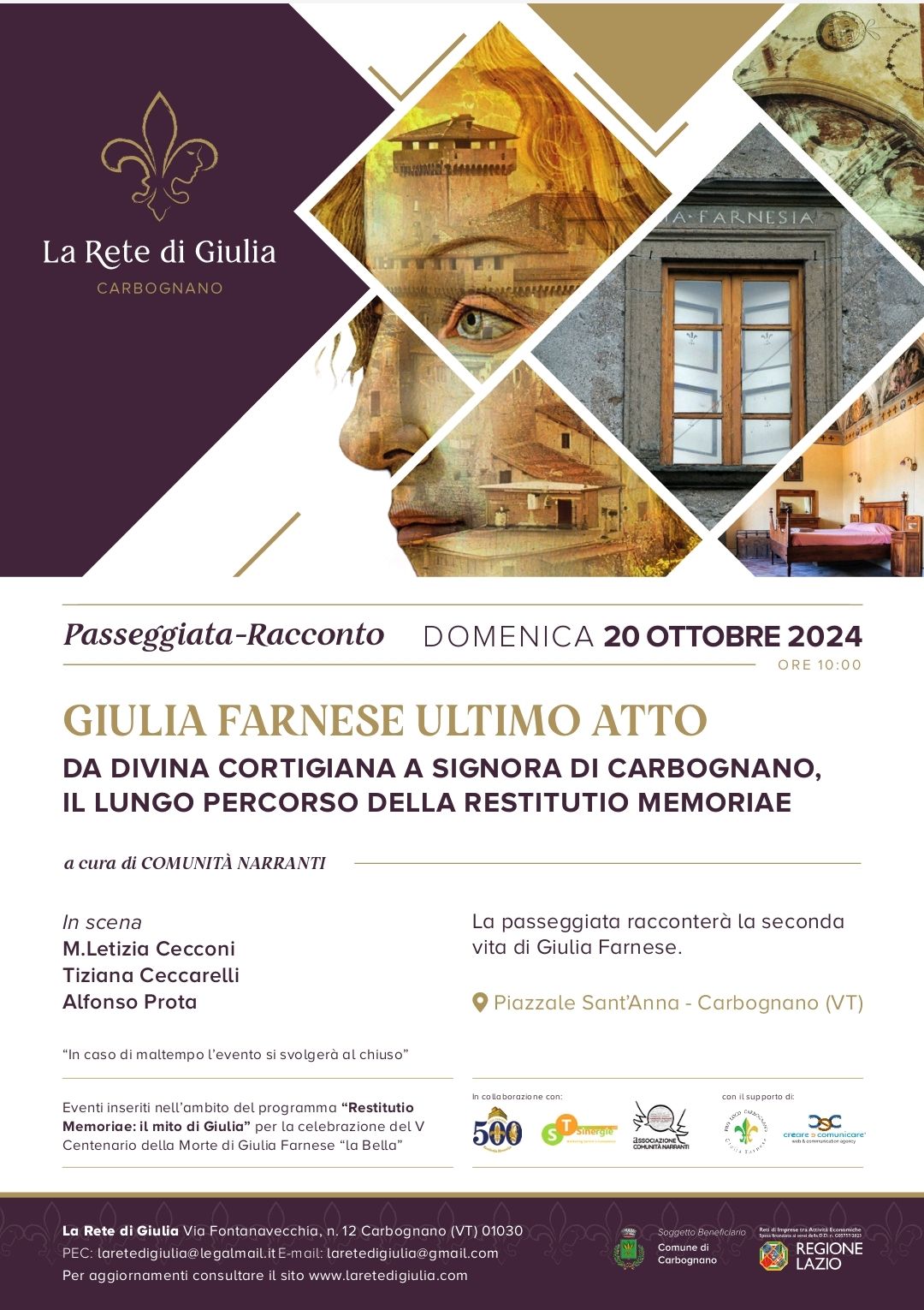 La vita adulta e libera dagli intrighi politici che la vollero, giovanissima e ancora inesperta delle cose della vita, alla corte di Rodrigo Borgia. Racconteremo la sua ribellione, la decisione di lasciare Roma e di trasferirsi, appunto, a Carbognano dove, convolatain seconde nozze con Giovanni Maria Capece Bozzuto, trascorrerà gli anni della maturità, fino alla morte avvenuta nel 1524. Verrà raccontato della sua rinascita,delle sue capacità imprenditoriali, della sua devozione, del bene che seppe fare al piccolo borgo della Tuscia e ai suoi abitanti. In scena Maria Letizia Cecconi, Tiziana Ceccarelli e Alfonso Prota che ridaranno voce a Giulia “la Bella” per far conoscere ai partecipanti gli aspetti meno conosciuti della sua articolata e sfaccettata esistenza.Sempre domenica, ma alle ore 11.45, nella chiesa di Santa Maria dell’Immacolata Concezione, è in programma il vernissage della mostra collettiva “Giulia Farnese ‘laBella’ nel contemporaneo”, a cura di Massimo Scaringella.