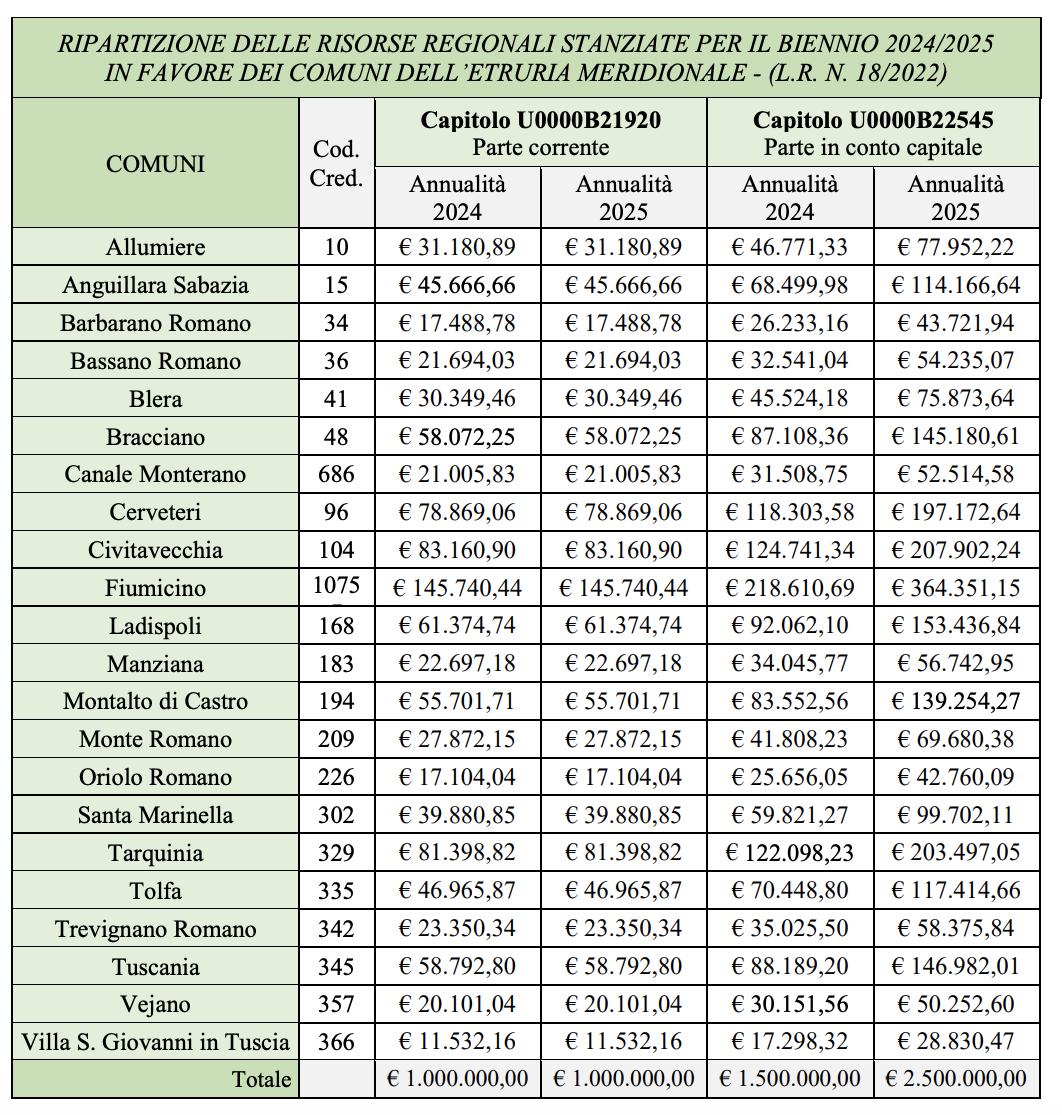 La Regione Lazio, nei giorni scorsi, ha approvato la ripartizione delle risorse stanziate per il biennio 2024-2025 in favore di 22 Comuni.