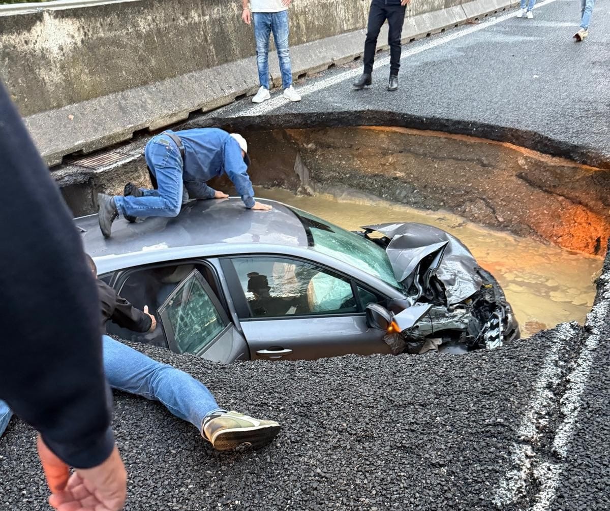 Un’auto in corsa, con una ragazza alla guida, è stata letteralmente inghiottita dall’enorme buca.