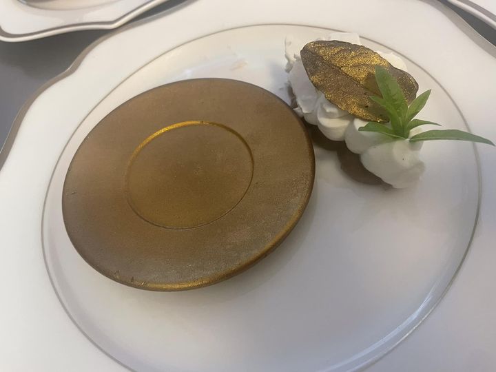 E’ nato così il cremoso al cioccolato, a forma di piatto, servito con crema di marroni, panna meringa e ricotta.