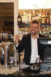 Mentre “Terra di Tuscia” è il dolce che rende omaggio al territorio, e riempie gli occhi solo a guardarlo, nella sua ganasche montata alla nocciola dei monti cimini, olio evo e miele, accompagnata da terriccio di cacao e polvere di funghi, finocchietto, mentuccia ed erbe spontanee. Un tripudio di sapori dove l’estrema dolcezza è bilanciata dalla freschezza delle erbe, accanto a questa proposta anche i più classici tozzetti accostati all’Aleatico. I pasti sono accompagnati da un viaggio nel mondo del pane, compaiono così grissini e favoloso pane briosciato, a soddisfare la voglia di vino ci pensa invece Bruno Manfredini (in foto sotto a six) giovanissimo e preparato sommelier che accoglie i clienti con professionalità e simpatia.