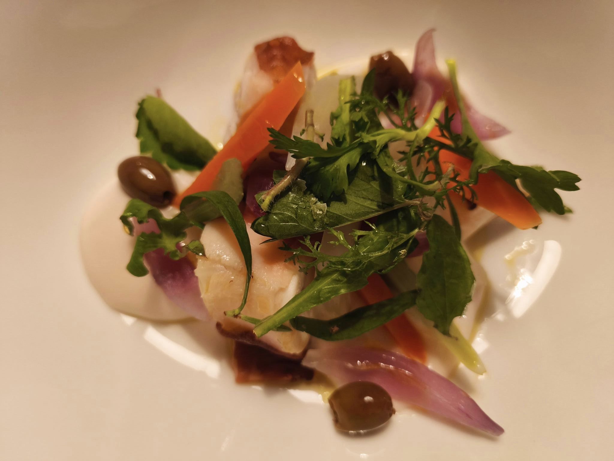 Tra gli antipasti, la proposta che più ci ha colpito la catalana di polpo al vapore con cipolle in osmosi, erbe aromatiche, olive taggiasche e verdure di stagione, tre diverse consistenze per un piatto dai sapori contrastanti.