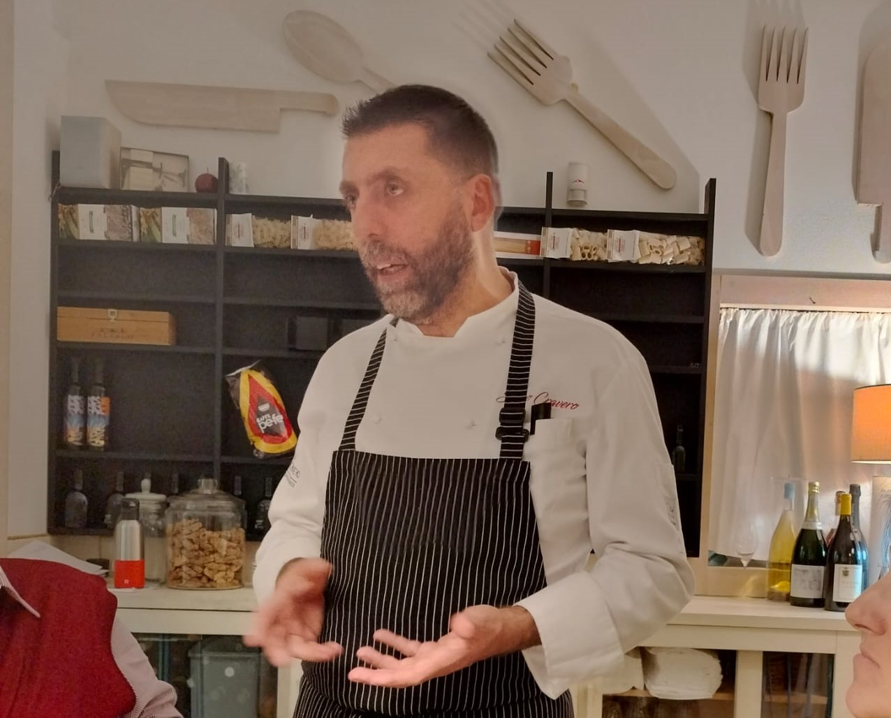 Per dare il benvenuto ai clienti Cravero (maestro dei lievitati) mette in tavola il suo alveolato e fragrante pane, realizzato con grani antichi e lievito madre “personale” accompagnato a ottimo olio della Tuscia.