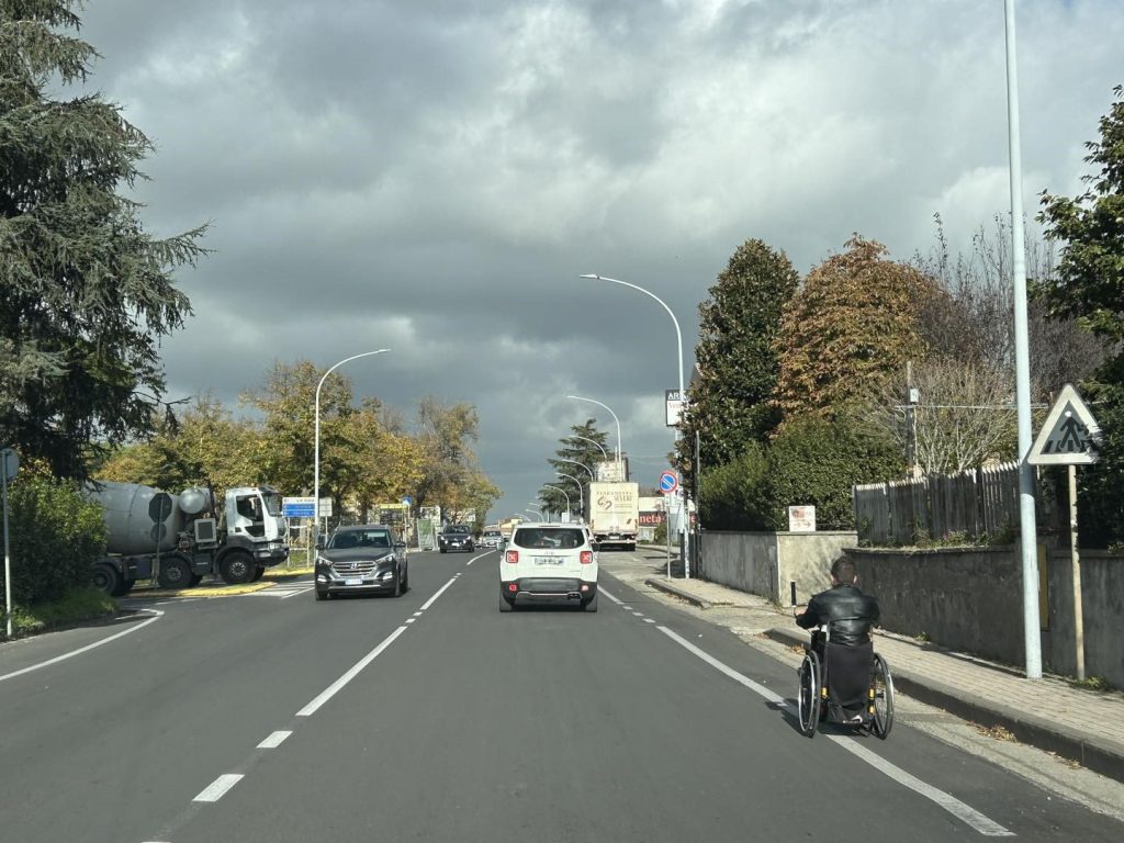 I pedoni, ma ancora di più le persone su una carrozzina o in generale di diversamente abili, sono letteralmente costretti a viaggiare sulle corsie della strada ad alto scorrimento. Un pericolo mortale, obbligato da chi deve però percorrere quella via per andare a casa o raggiungere un supermercato.