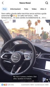 BOLOGNA – “Guida proprio bene”, “è il futuro”. Sono i commenti di Vasco Rossi che a Los Angeles negli Stati Uniti si filma a bordo di un’auto a guida autonoma. Il video, condiviso sui social, fa il pieno di commenti e condivisioni. “Sono salito a bordo della macchina senza autista a guida autonoma! Un salto nel futuro – scrive Vasco su Facebook – …nella fantascienza… Mi sono sentito incredibilmente al sicuro. È stata un’esperienza straordinaria”.