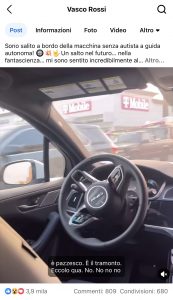 BOLOGNA – “Guida proprio bene”, “è il futuro”. Sono i commenti di Vasco Rossi che a Los Angeles negli Stati Uniti si filma a bordo di un’auto a guida autonoma. Il video, condiviso sui social, fa il pieno di commenti e condivisioni. “Sono salito a bordo della macchina senza autista a guida autonoma! Un salto nel futuro – scrive Vasco su Facebook – …nella fantascienza… Mi sono sentito incredibilmente al sicuro. È stata un’esperienza straordinaria”.
