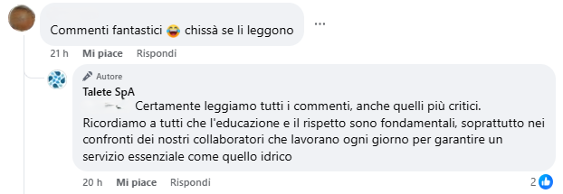 Talete, tuttavia, fa sapere di essere “sempre presente” con un messaggio quasi intimidatorio, dettato sicuramente dalla frustrazione di chi è addetto alla gestione social della pagina della società, che ogni giorno deve leggere certe esternazioni.