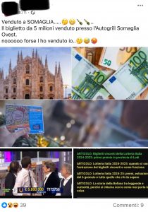 ROMA – Il post su facebook di una dipendente è eloquente: “Venduto a Somaglia…. Il biglietto da 5 milioni venduto presso l’autogrill Somaglia Ovest. Nooooooo forse l’ho venduto io…”. E’ caccia al “superfortunato” che ha acquistato in provincia di Lodi il biglietto vincente della Lotteria Italia.