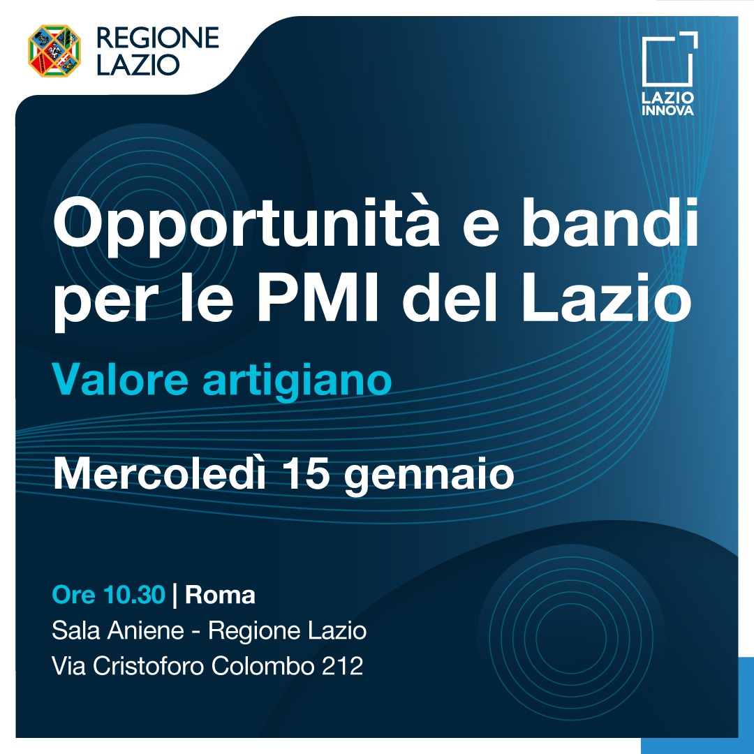 ROMA – Domani, mercoledì 15 gennaio, la Regione Lazio presenterà il Bando ”Valore Artigiano”, destinato alle imprese artigiane del territorio. L’appuntamento, si legge in una nota, è alle 10.30 a Roma, presso la sala Aniene della Regione Lazio (via Cristoforo Colombo 212).