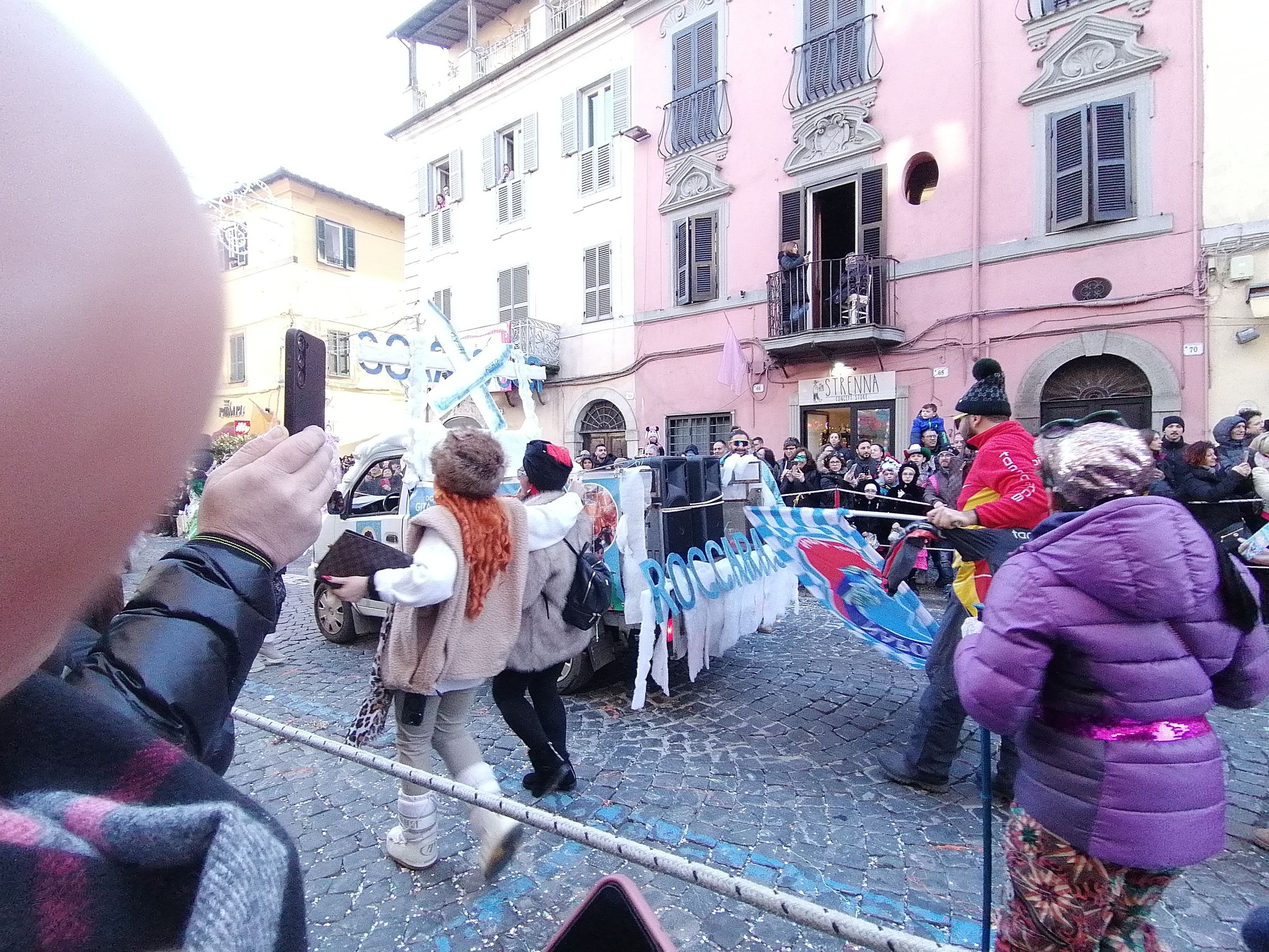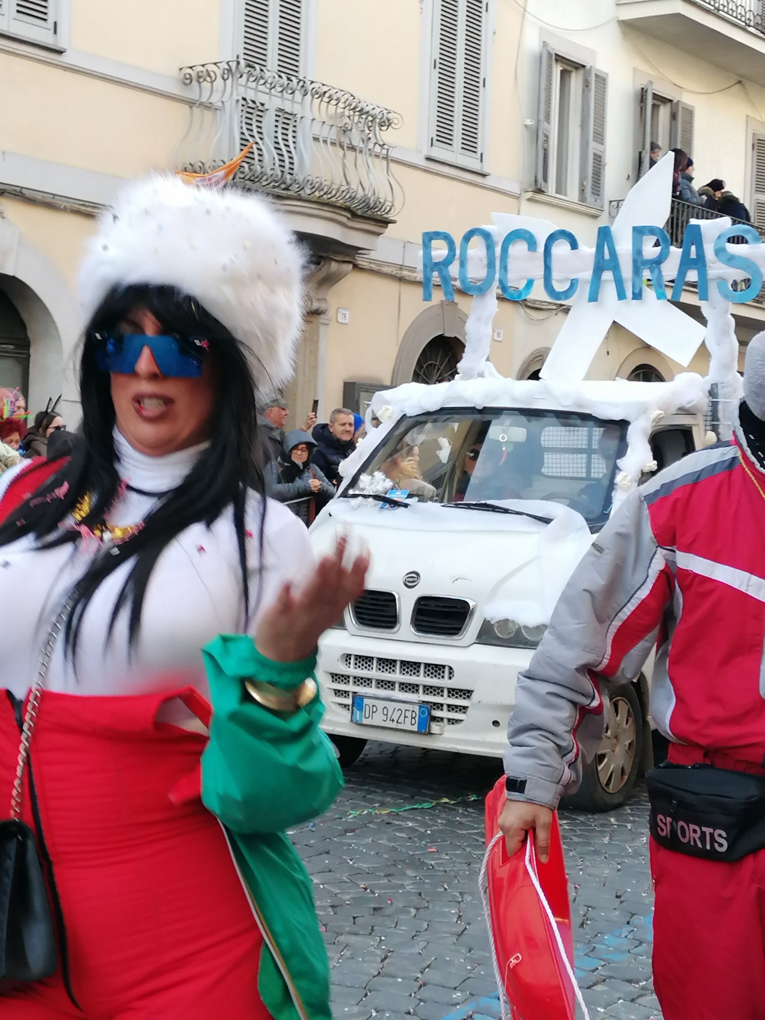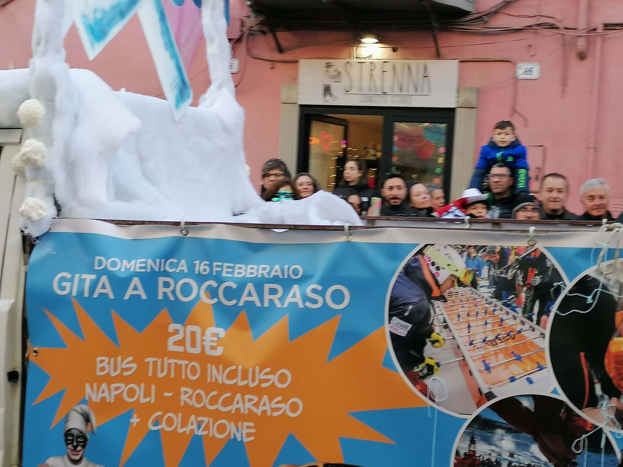 A guidare il carro una maschera dedicata proprio a lei, Rita De Crescenzo, seguita da una serie di persone in tuta da sci. In mezzo un furgoncino addobbato con ovatta a mo’ di neve con una serie di cartelli che pubblicizzano le vacanze giornaliere low cost.