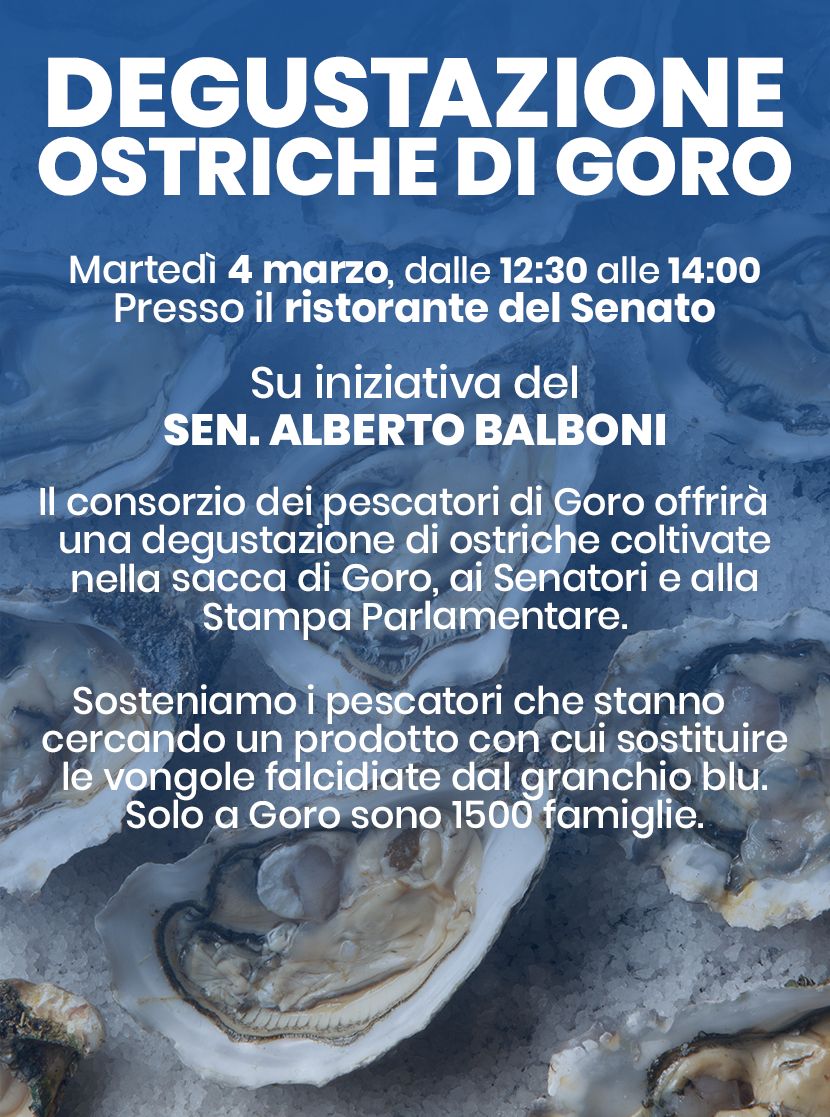 “Martedì 4 marzo, a partire dalle 12.30 e fino alle 14, sarà offerta una degustazione di ostriche, coltivate nella Sacca di Goro dal Consorzio Pescatori di Goro, presso il ristorante del Senato. Le ostriche di Goro rappresentano un’importante alternativa economica alla coltivazione delle vongole veraci, ormai compromessa dall’abnorme proliferazione del granchio blu. Si è infatti riscontrato che il granchio non riesce a frantumare il guscio dell’ostrica, a differenza di quanto fa facilmente con quello delle vongole. Ho avuto modo di assaggiare l’ostrica di Goro e garantisco che non ha nulla da invidiare a quelle di importazione. Promuoverne il consumo ha pertanto l’importante scopo di sostenere il reddito di una intera categoria in un momento di grave difficoltà, nonché di favorire la conoscenza di un prodotto nazionale di eccellenza che non teme confronti. Questa iniziativa ha l’obiettivo di sostenere i pescatori che stanno cercando un prodotto con cui sostituire le vongole falcidiate dal granchio blu. Solo a Goro sono 1500 famiglie”.