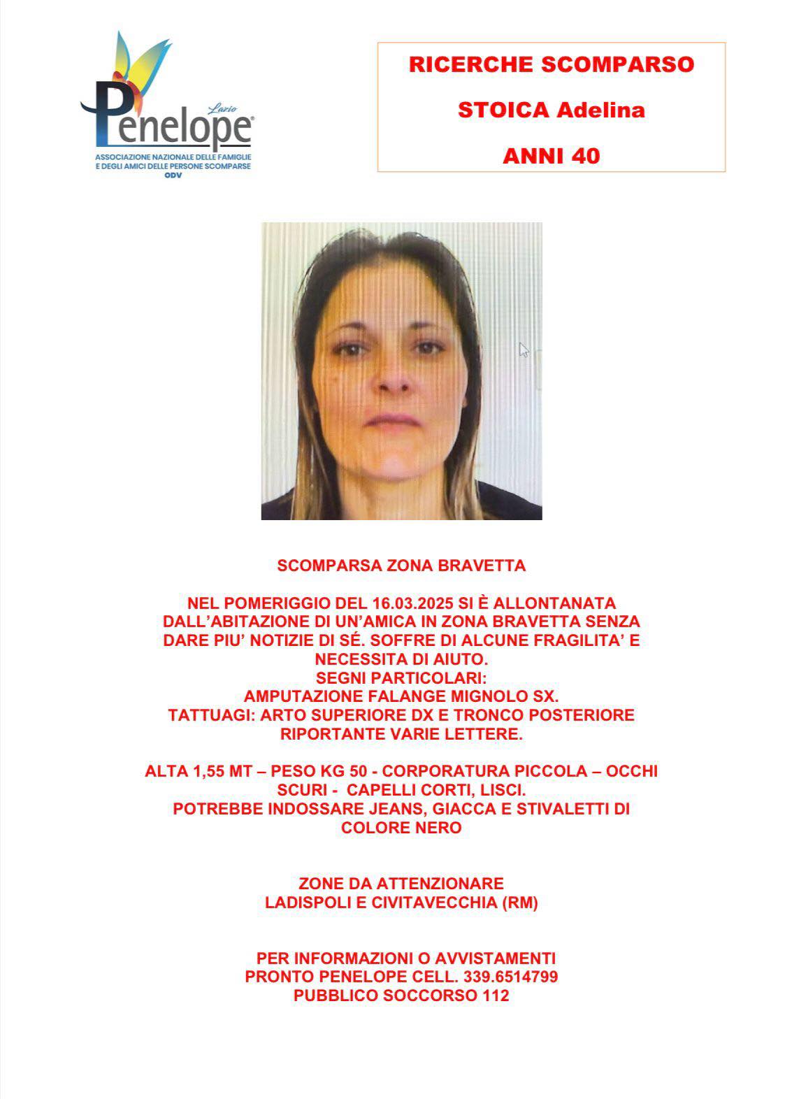 “Chiunque abbia informazioni utili per ritrovare Adelina ci contatti al nostro numero di emergenza Pronto Penelope 339 6514799”, fanno sapere dall’associazione, che ora sta battendo le ricerche tra Civitavecchia e Ladispoli, dove la scomparsa potrebbe trovarsi in questo momento.