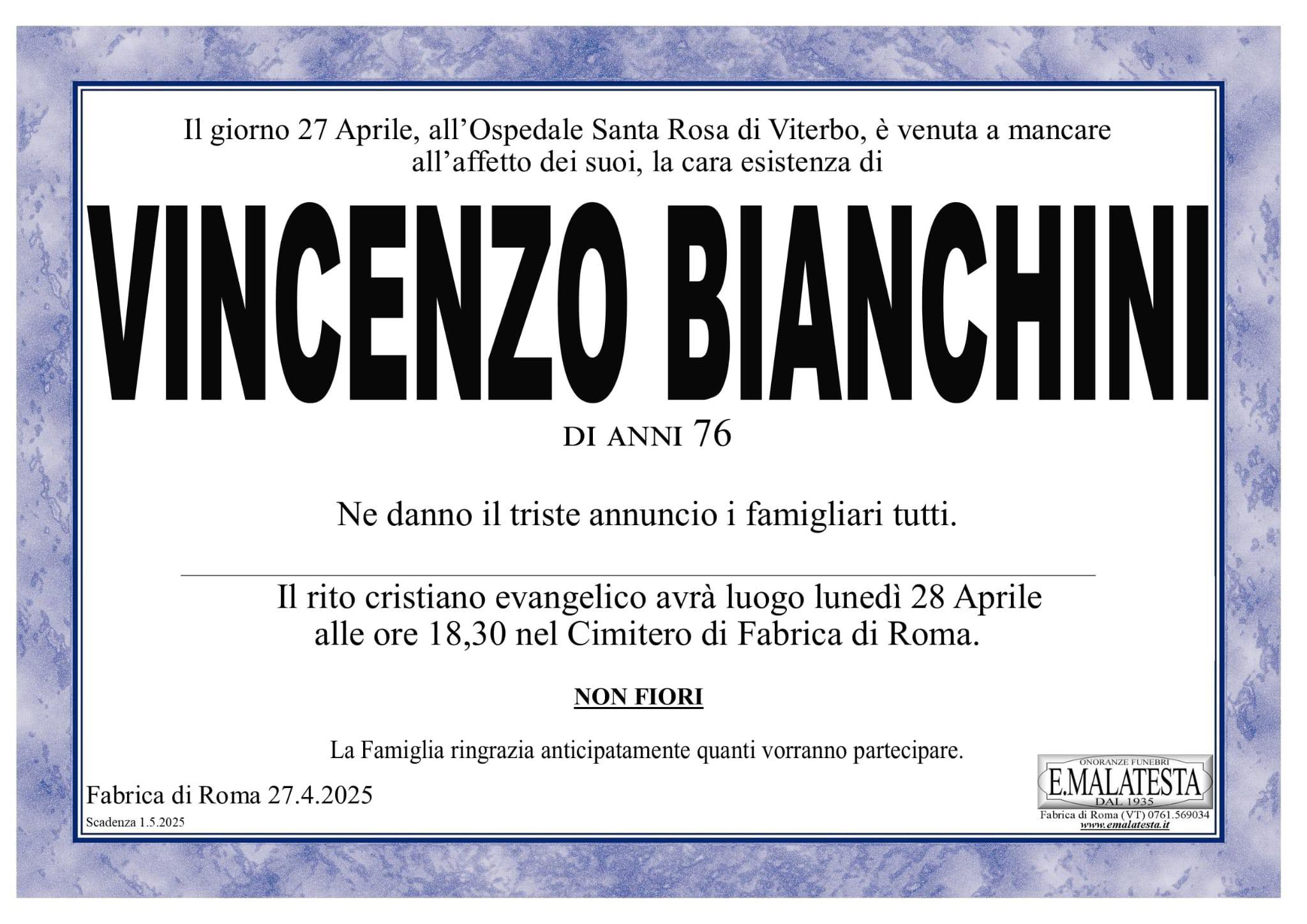 A compiangerlo non sono solo i cittadini, ma anche la stessa amministrazione, che saluta Bianchini con un messaggio ufficiale e invita tutti a presenziare al rito cristiano evangelico che si terrà oggi, lunedì 28 aprile, alle 18.30 presso il cimitero di Fabrica di Roma.