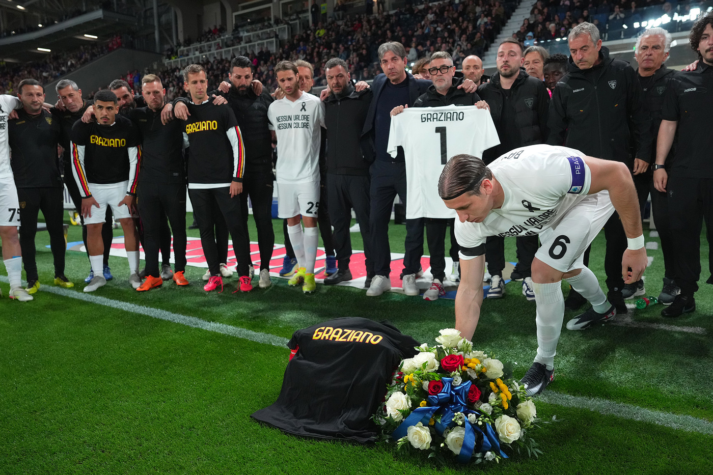 Da stamani un fiume di tifosi, famiglie, dirigenti e la stessa squadra, domenica notte rientrata da Bergamo dopo la gara della discordia, quella con l’Atalanta, la lecita battaglia morale del gruppo giallorosso che non avrebbe voluto scender in campo, devastato dalla scomparsa del suo fisioterapista, nella notte tra mercoledì e giovedì scorso. La Lega ha imposto, nonostante l’indignazione il Lecce è sceso in campo, strappando un pari a Bergamo potenzialmente preziosissimo per la lotta salvezza. Una salvezza che diventa il traguardo dedicare a Graziano, lassù.