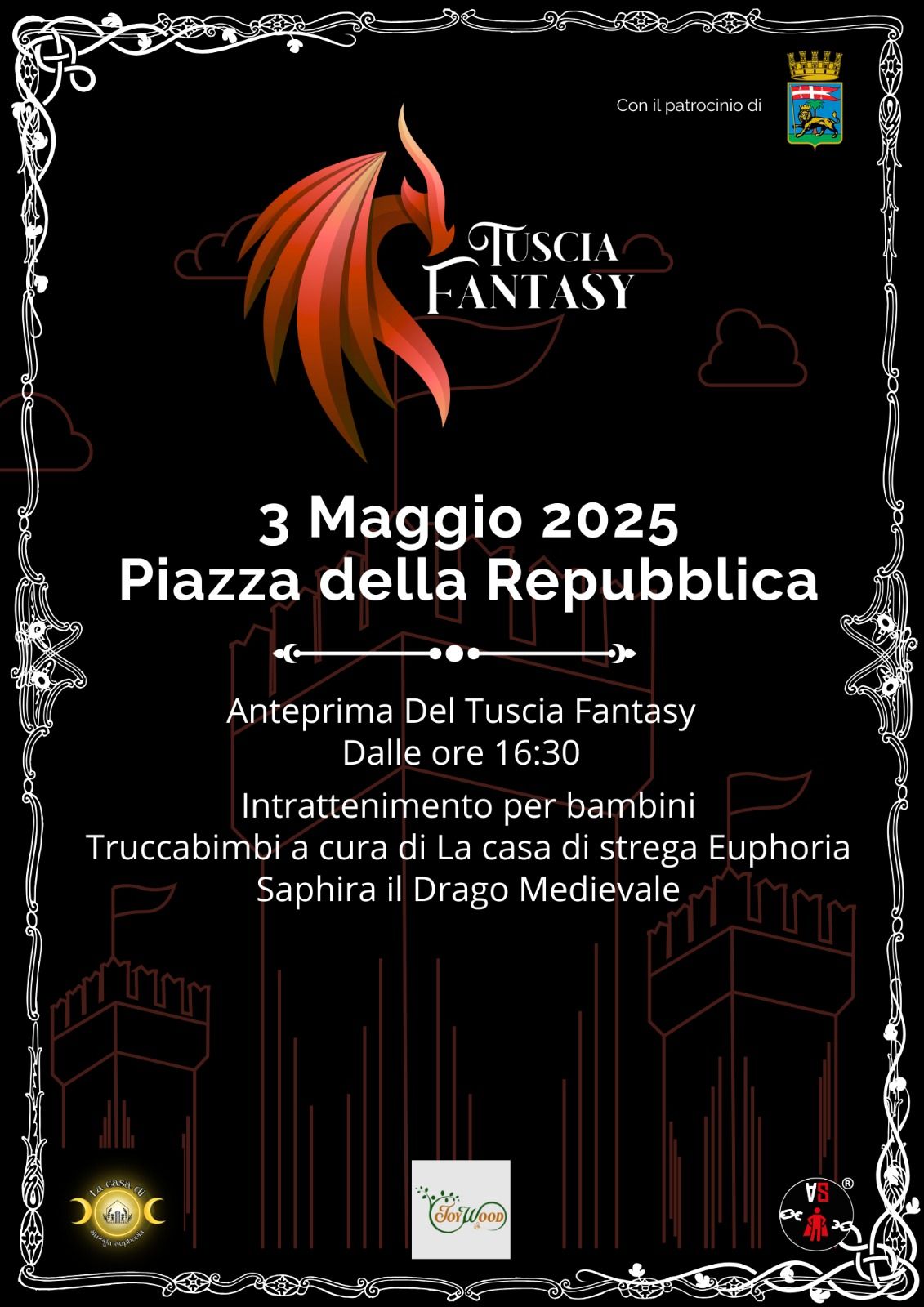 L’appuntamento del 3 maggio a piazza della Repubblica (a partire dalle 16.30) sarà un piccolo assaggio di come Viterbo si trasformerà dal 16 al 18 maggio, quando piazze e vie accoglieranno una fiera dedicata al fantasy e alla cultura pop, con spettacoli, musica, intrattenimento, cosplay, gara cosplay e mercatini.