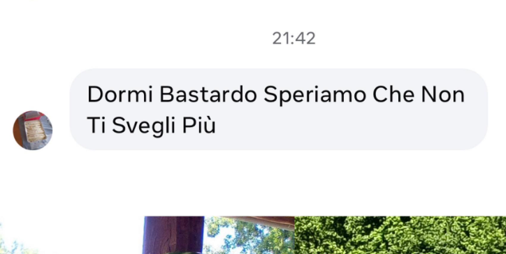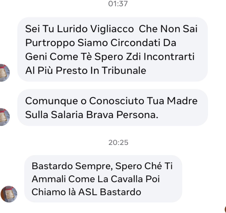 “Spero che non ti svegli più, bastardo” è uno di questi, ma non mancano offese alla mamma di Rizzi: “Ho conosciuto tua madre sulla Salaria, brava persona”.