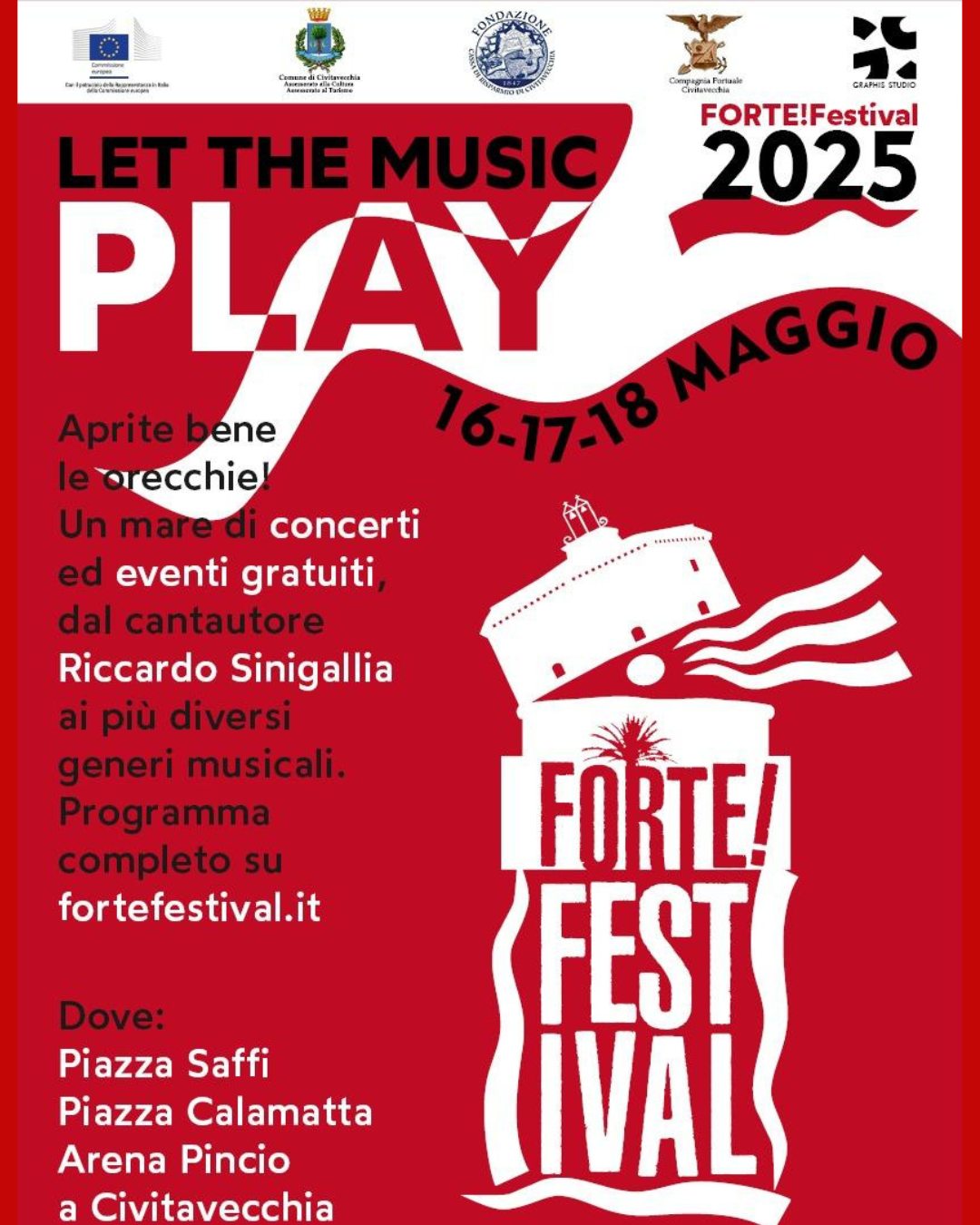 PIENDIBENE: “Civitavecchia si prepara a vivere tre giorni di musica, arte e cultura con il Forte Festival, un evento gratuito che animerà la città con concerti, mostre, laboratori, presentazioni di libri e tantissime iniziative adatte a tutte le età. Musica, cultura e partecipazione sono lo spirito del Forte Festival, realizzato grazie alla collaborazione tra L’Associazione Forte Festival, l’Amministrazione Comunale, la Compagnia Portuale, Graphis Studio e la Fondazione Cariciv”.