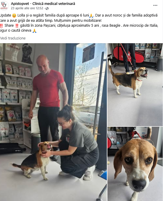 Ieri finalmente, sempre sulla pagina social della clinica, la bella notizia: Lolla ha ritrovato i suoi padroni, dopo un periodo di lontananza durato sei mesi.