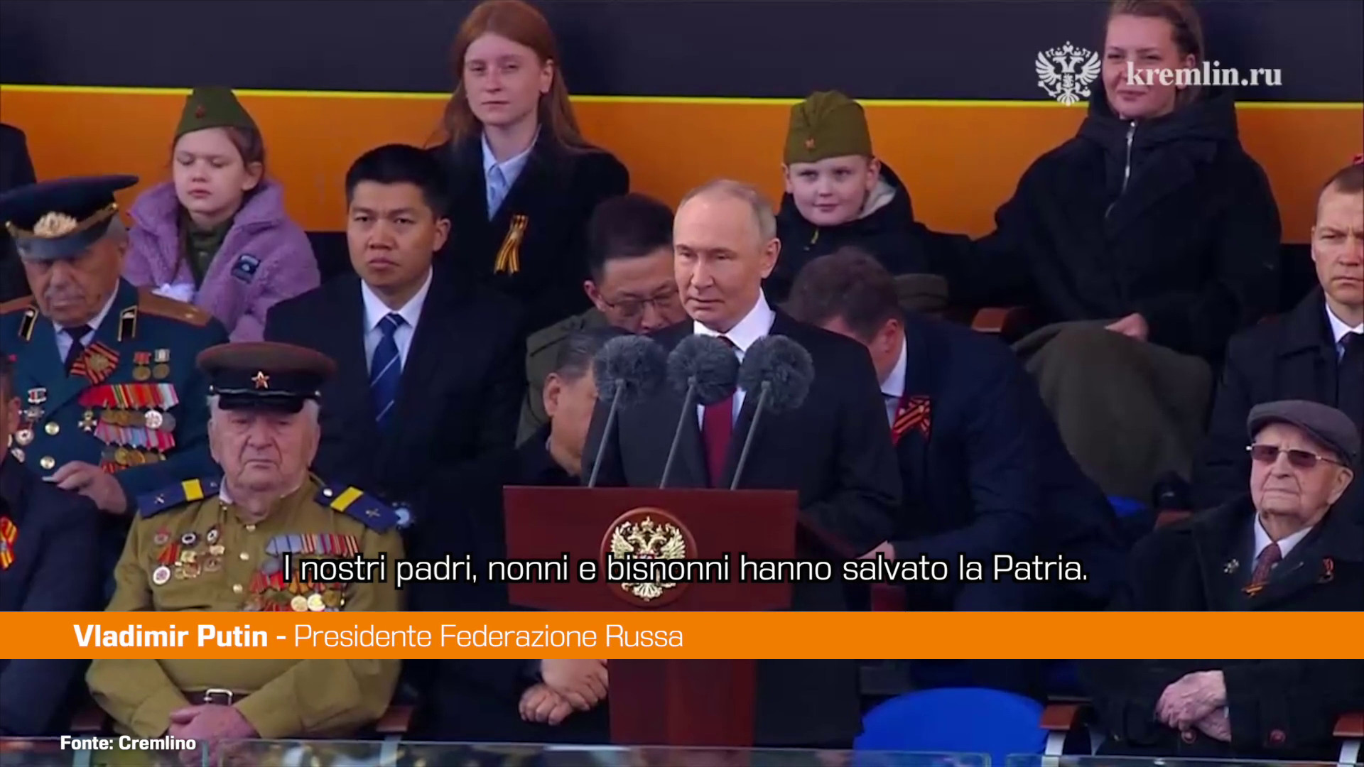 MOSCA (RUSSIA) (ITALPRESS) – “Ricordiamo le lezioni della Seconda Guerra Mondiale e non accetteremo mai la distorsione dei suoi eventi, i tentativi di giustificare i carnefici e calunniare i veri vincitori. Il nostro dovere è difendere l’onore dei soldati e dei comandanti dell’Armata Rossa, la grande impresa di rappresentanti di diverse nazionalità, che rimarranno per sempre nella storia del mondo come soldati russi. La Russia è stata e sarà una barriera indistruttibile contro il nazismo, la russofobia, l’antisemitismo e combatterà le atrocità commesse dai sostenitori di queste idee aggressive e distruttive. Verità e giustizia sono dalla nostra parte. L’intero Paese, la società e il popolo sostengono i partecipanti all’operazione militare speciale. Siamo orgogliosi del loro coraggio e della loro determinazione, di quella forza d’animo che ci ha sempre portato solo la vittoria”. Così il presidente russo Vladimir Putin, in occasione della parata per il 9 maggio, che ricorda la vittoria nella seconda guerra mondiale. sat/gsl (Fonte video: Cremlino)