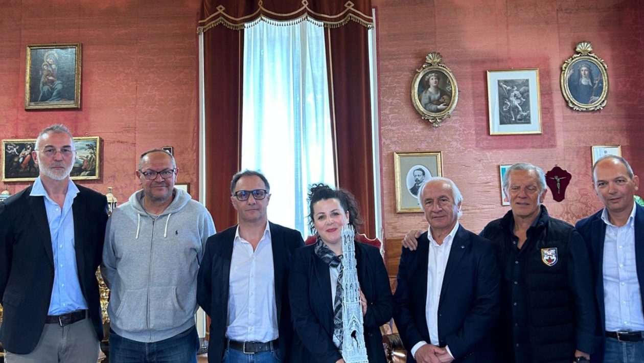 VITERBO – Lo scorso lunedì 12 maggio il bozzetto n. 1 di Dies Natalis è stato consegnato alla sindaca Chiara Frontini. Con una breve ma suggestiva cerimonia all’interno della Sala Rossa di Palazzo dei Priori, la prima cittadina ha accolto il presidente del Sodalizio Facchini di Santa Rosa Massimo Mecarini e il capofacchino Luigi Aspromonte, l’architetto Raffaele Ascenzi, ideatore dell’attuale Macchina di Santa Rosa, insieme al costruttore Vincenzo Fiorillo.