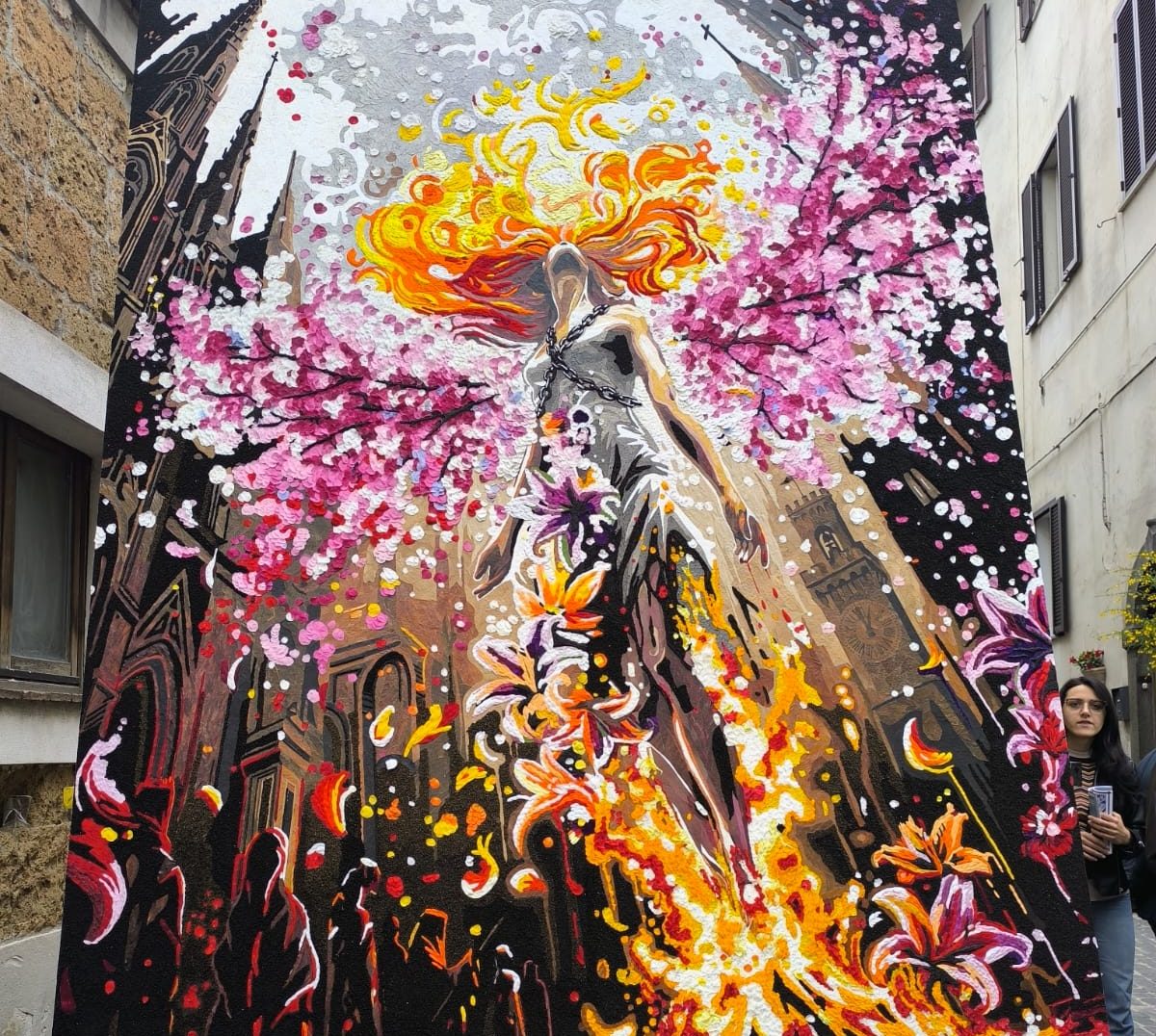 Questa la relazione da accompagnamento al capolavoro mosaico floreale “Mi hanno tolto la voce, il diritto di scegliere, la libertà di essere me stesso. Credevano di ridurmi in cenere, ma come una fenice h trasformato il fuoco in rinascita. Anche se il mio corpo porta i segni della loro violenza, la mia anima vola in altro e arde eterna. Perché la libertà non si piega, non si spegne, non si consuma. Brucia. Viva” Una freschissima mattinata domenicale fa da scenario ai Gruppi che dopo la “notte bianca” del Sabato passata ad attaccare le essenze floreali ed a rifinire i dettagli su tavola girovagano allegramente, spenseriatamente, goliardiacamente per le vie del centro storico in attesa di posizionale il Pugnalone nella postazione assegnata loro dalla Pro Loco. Alle ore 11.00 momento religioso presso la Basilica Concattedrale del Santo Sepolcro con solenne Messa cantata in cui il Parroco Don Enrico Castauro invia il suo personale messaggio alla popolazione : “Secondo una tradizione ben consolidata nel 1166 ha inizio la Festa della Madonna del Fiore. Di questa i Pugnaloni sono l’espressione più folcloristica e significativa da molti punti di vista. Tra i quali, in particolare, è bello richiamarne, almeno due: la rappresentazione iconica della libertà e la dimensione comunitaria che si esprime nella loro realizzazione. I Pugnaloni, ad una attenta analisi, nel corso dei tanti secoli sembra che abbiano assunto la funzione del Ciliegio miracolosamente fiorito. Se vogliamo, oggi, i Pugnaloni incarnano un valore spirituale, che in principio non avevano. Ovvero esortano, con le immagini sapientemente realizzate da ogni singolo Gruppo, a lottare per la libertà perché questo è possibile, se lo si vuole, insieme. Appunto, insieme è la prola, che meglio esprime la Festa della Madonna del Fiore. Insieme si intreccia storia, fede e folklore, così che è impossibile scindere gli uni dagli altri, perché sono l’anima di questo popolo, che fa memoriale della sua fondazione come comunità civile e religiosa. La Festa è perciò espressione di questa religiosità del popolo. Una Festa, anch’essa, liberatoria: dove la fatica della lotta quotidiana per esserci, prende fiato nel gioioso condividere lo sforzo affinché tutto riesca, secondo la tradizione, senza forzature, che potrebbero rompere questo equilibrio, questo armonico incontrarsi delle diversità, nell’unità di sentirsi un popolo. Al popolo, infatti, appartiene la Festa della Madonna del Fiore, e nel realizzarla nelle sue tre dimensioni: storia, fede ed il folclore. I Pugnaloni hanno dal popolo l’investitura e la responsabilità di esprimere in modo originalissimo, l’unità”.
