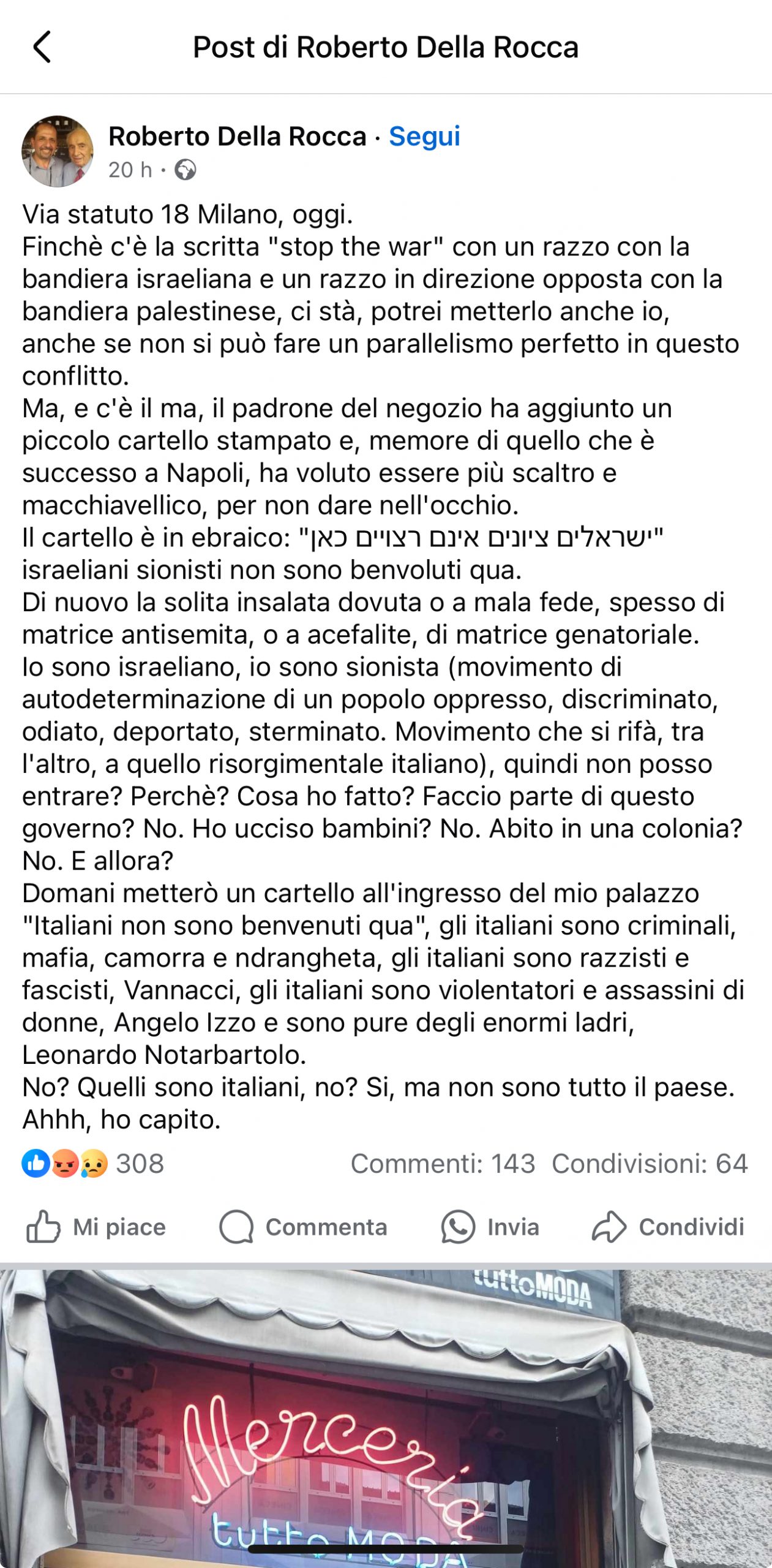 MILANO – Un cartello scritto in ebraico “israeliani e sionisti non sono i benvenuti qui” è stato messo sulla porta di un negozio nel pieno centro di Milano. A denunciarlo, in un post con tanto di foto della merceria in questione, è stato Roberto Della Rocca membro della Camera di commercio israelo-italiana. “Finchè c’è la scritta “stop the war” con un razzo con la bandiera israeliana e un razzo in direzione opposta con la bandiera palestinese, ci sta, potrei metterlo anche io” ha scritto. Ma il cartello in ebraico “per non dare nell’occhio” va oltre, dovuto a “mala fede, spesso di matrice antisemita”, o “acefalite”.